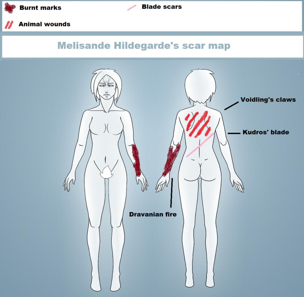 Two long transversal scars in the back: one seemed to have been made by huge claws, the other by a blade.